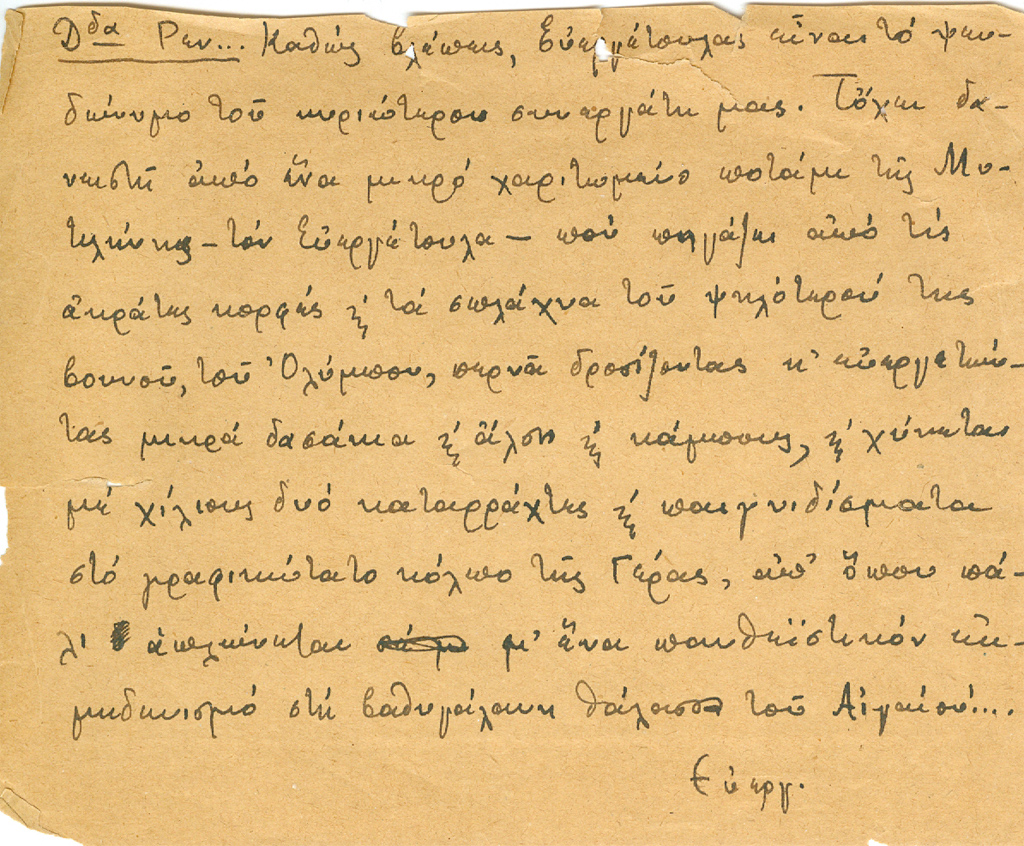 «Καθώς βλέπεις, Ευεργέτουλας είναι το ψευδώνυμο του κυριώτερου συνεργάτη μας. Τόχει δανειστεί από ένα μικρό χαριτωμένο ποτάμι της Μυτιλήνης – τον Ευεργέτουλα – που πηγάζει από τις ακράτες κορφές και τα σπλάχνα του ψηλότερού της βουνού, του Ολύμπου, περνά δροσίζοντας κ’ ευεργετώντας μικρά δασάκια και άλση και κάμπους, και χύνεται με χίλιους δυο καταρράχτες και παιγνιδίσματα στο γραφικώτατο κόλπο της Γέρας, απ’ όπου πάλι απλώνεται μ’ ένα πανθεϊστικόν εκμηδενισμό στη βαθυγάλανη θάλασσα του Αιγαίου!…».
