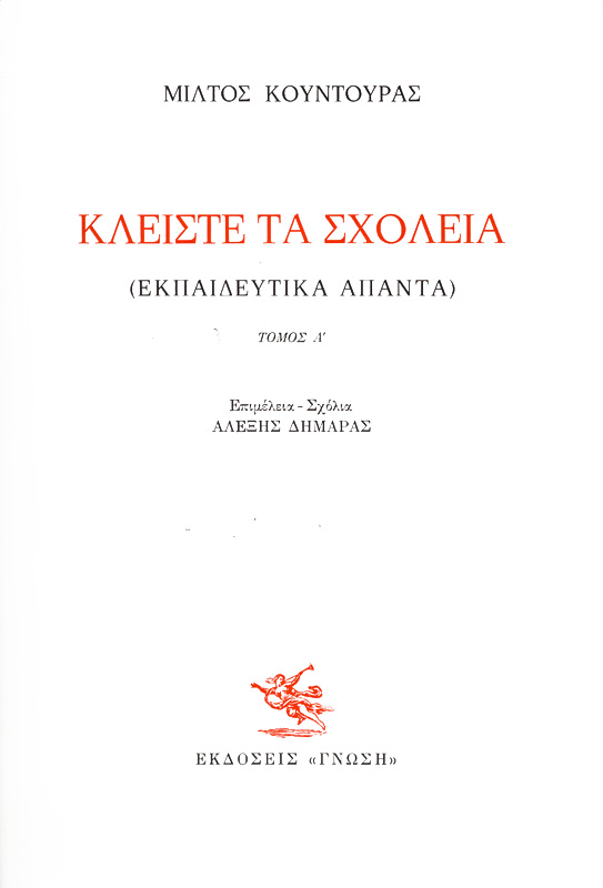 4. Μίλτος Κουντουράς, Κλείστε τα Σχολειά (Εκπαιδευτικά Άπαντα), τόμοι Α΄& Β΄, Επιμέλεια – Σχόλια: Αλέξης Δημαράς, εκδόσεις «Γνώση», Αθήνα, 1985