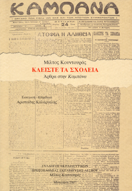 6. Μίλτος Κουντουράς, Κλείστε τα Σχολειά, άρθρα στην Καμπάνα, Εισαγωγή – Επιμέλεια: Αριστείδης Καλάργαλης, Έκδοση: Σύλλογος Εκπαιδευτικών Πρωτοβάθμιας Εκπαίδευσης Λέσβου «Μίλτος Κουντουράς», τυπογραφείο Δ. Δούκας & Σία, Μυτιλήνη, 2007
